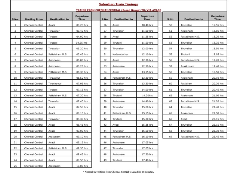 Local Train Time Table Chennai To Avadi / As they plan to revise the suburban train timetable, about 30 special suburban services are likely to get regularised.